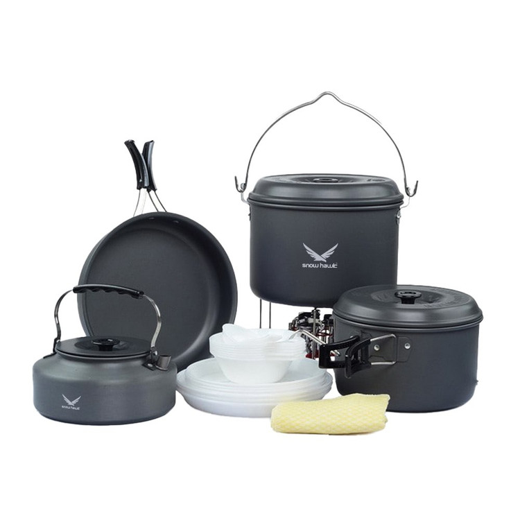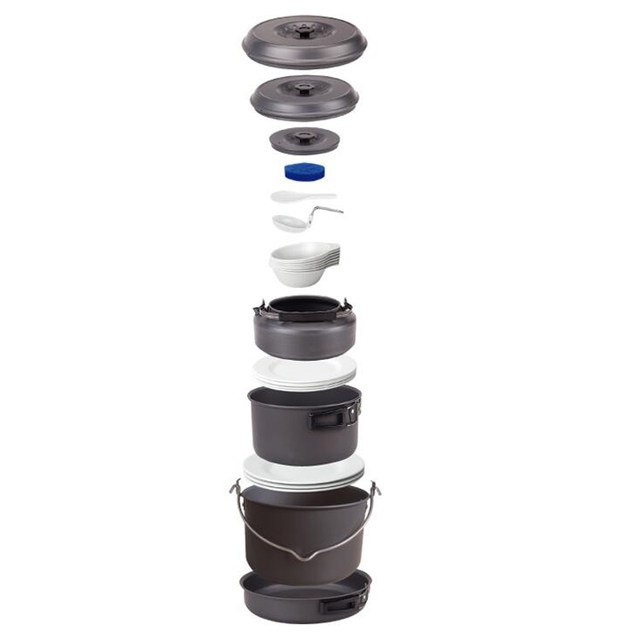 ست ظروف کوهنوردی 7 نفره اسنوهاک کد SN.C9 شامل دو عدد قابلمه درب دار (در سایزهای بزرگ و کوچک) ، یک عدد ماهیتابه ، یک عدد کتری 1.6 لیتری ، 3 عدد بشقاب بزرگ ، 4 عدد بشقاب کوچک ، 6 عدد کاسه ، قاشق و یک عدد ملاقه می باشد تمام آن چیزی است که برای یک پخت و پز کامل در طبیعت موردنیاز است.
