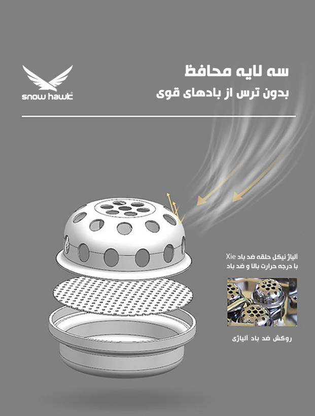 - دارای شعله های سه لایه که یک لایه کاملا ضد باد است و