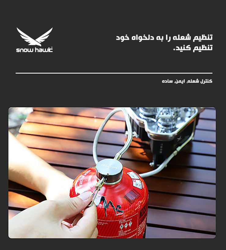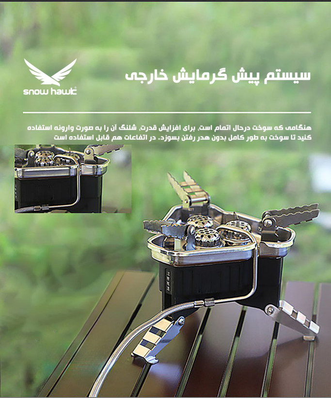 طراحی ضد نشتی دو کاناله این سرشعله سه مشعل شلنگ دار اسنوهاک از نشت گاز جلوگیری می کند، که این موضوع بسیار حیاتی و ایمنی است. ابعاد حالت بازشده 22×15 سانتی متر (ارتفاع / قطر) و حالت جمع شده 12.5×16.1 سانتی متر (ارتفاع / قطر) می باشد.