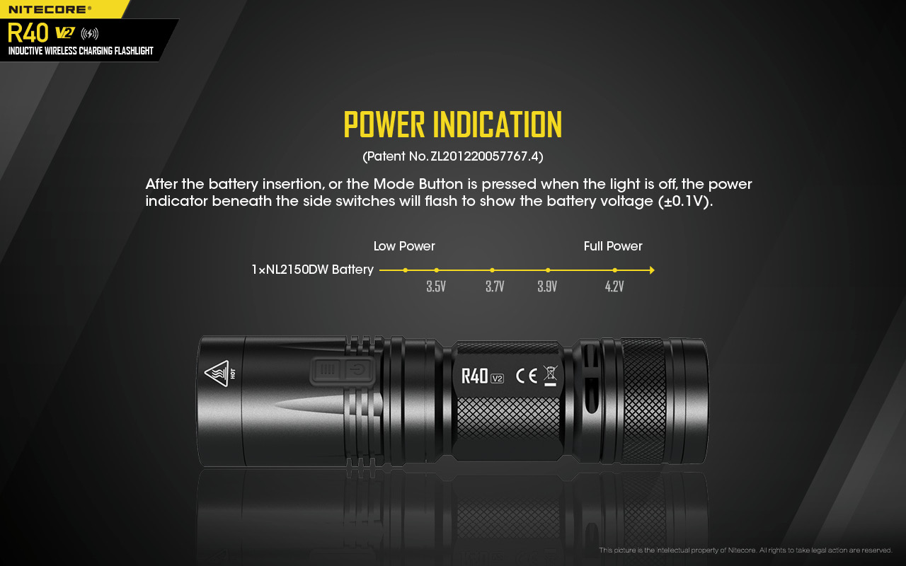 نشانگر باتری در زیر کلید با چشمک زدن ولتاژ باتری را نشان خواهد داد. بعد از جایگذاری باتری یا با فشار دادن دکمه Mode در زمان خاموش بودن چراغ قوه، نشانگر باتری در زیر کلید چشمک خواهد زد تا ولتاژ باتری را نشان دهد. برای مثال هنگامیکه ولتاژ باتری 4.2V است، نشانگر باتری 4 بار چشمک و بعد از یک مکث یک و نیم ثانیه ای دو چشمک دیگر خواهد زد.