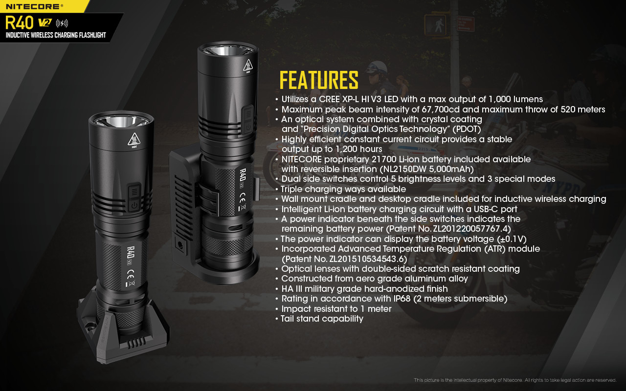 چراغ قوه R40 نسخه 2 کمپانی نایتکر دارای طراحی ویژه برای عملیات جستجو و نجات با قابلیت شارژ بی سیم و چندگانه است که درسال 2020 به بازار عرضه شده است و حداکثر تا فاصله 520 متر را می تواند برای شما روشن کند. قدرت خروجی روشنایی این چراغ قوه پلیسی با توجه به ال ای دی CREE XP-L2 V3 که در آن کار شده نسبت به مدل قبلی خود 20 درصد افزایش داشته و به 1200 لومن رسیده است. در چراغ قوه R40 از باتری اختصاصی و قدرتمند 21700 شارژی لیتیوم یون استفاده شده که نتیجه آن ، بالا رفتن عملکرد مدت زمان نوردهی چراغ قوه است به طوری که در بیشترین حالت یعنی 1200 لومن 2 ساعت و 15 دقیقه و در کمترین حالت ( 50 لومن ) 38 ساعت مداوم روشن می ماند. امروز در فروشگاه جی لایت به بررسی کامل این محصول می پردازیم.