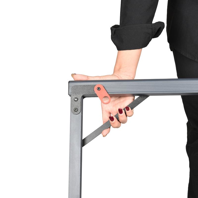 پایه ها و رویه میز ساخته شده از آلومینیوم باعث استحکام و وزن پایین آن می شود، همچنین اتصالات فلزی مقاومی داشته و تاشو بودن رویه آن باعث سهولت نظافت سطح میز می شود.