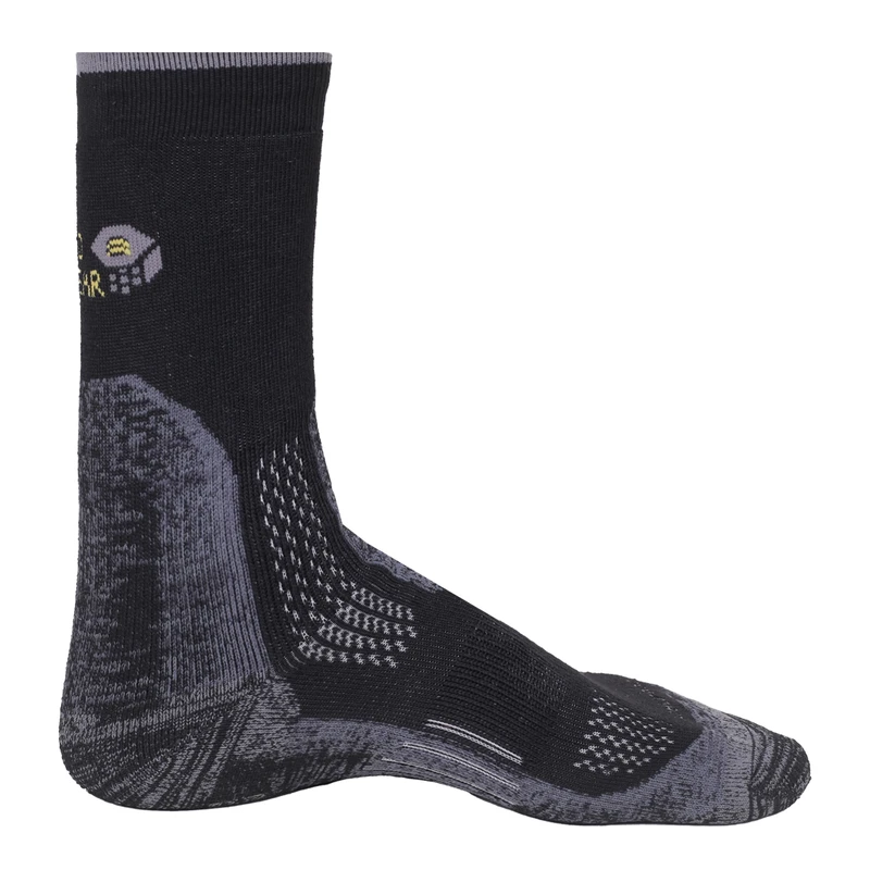 کشبافی هوشمند و حمایت از قوس پا: در قسمت میانی جوراب، از کشبافی با تراکم متفاوت استفاده شده است تا قوس پا را به خوبی در بر گرفته و از خستگی آن در مسافتهای طولانی بکاهد. این حمایت هدفمند، پایداری پا در کفش را افزایش میدهد.